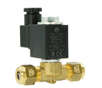 Electrovanne 2/2 voies, normalement fermée NF – accessible – corps en laiton – raccord Fastlock A3-A2L – bobine de 30 mm, classe H, certifiée UL avec connecteur ip67 – joint torique en HNBR 100 % sans PFAS, certifié OLAB.